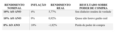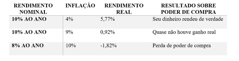 ➡️ Mesmo que os investimentos apresentem números “bonitos” de rendimento nominal, só o rendimento real mostra se você ganhou ou perdeu no dia a dia.